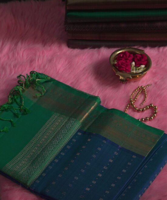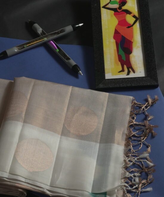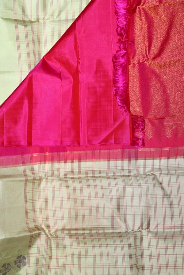 Ideal for weddings, festive occasions, or cultural events, this saree balances contemporary charm with heritage artistry. The creamy white base symbolizes purity and grace, while the red checks add a touch of vibrant energy. The floral putta border brings a regal finish, celebrating the intricacy of Kanchipuram weaving. Style it with pearl or gold jewelry to enhance its elegance, or opt for minimalist accessories to let the checks and florals shine.