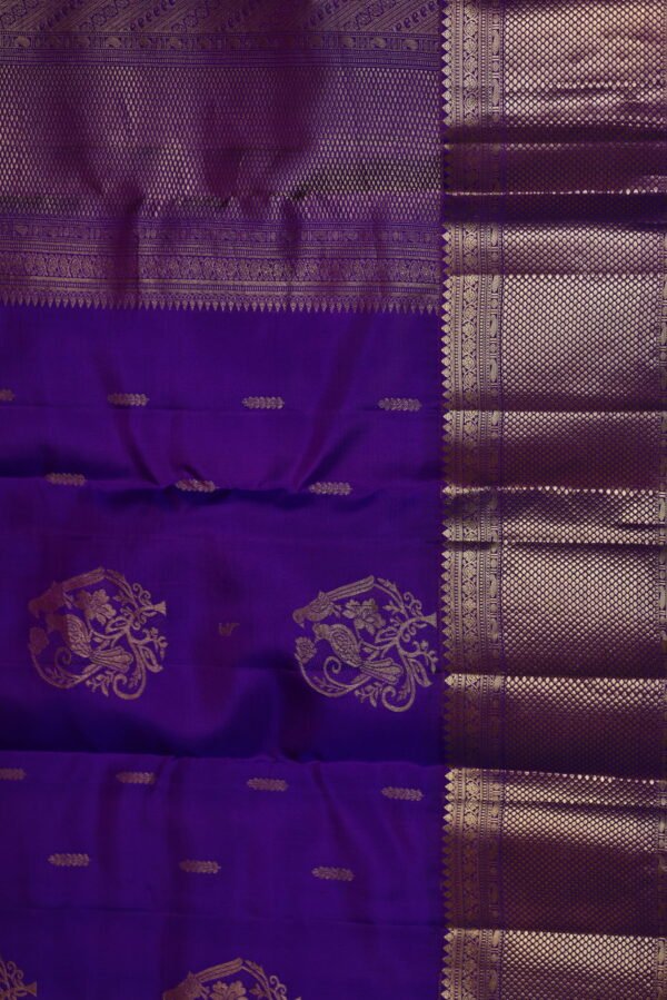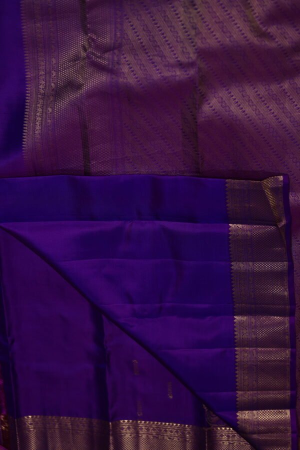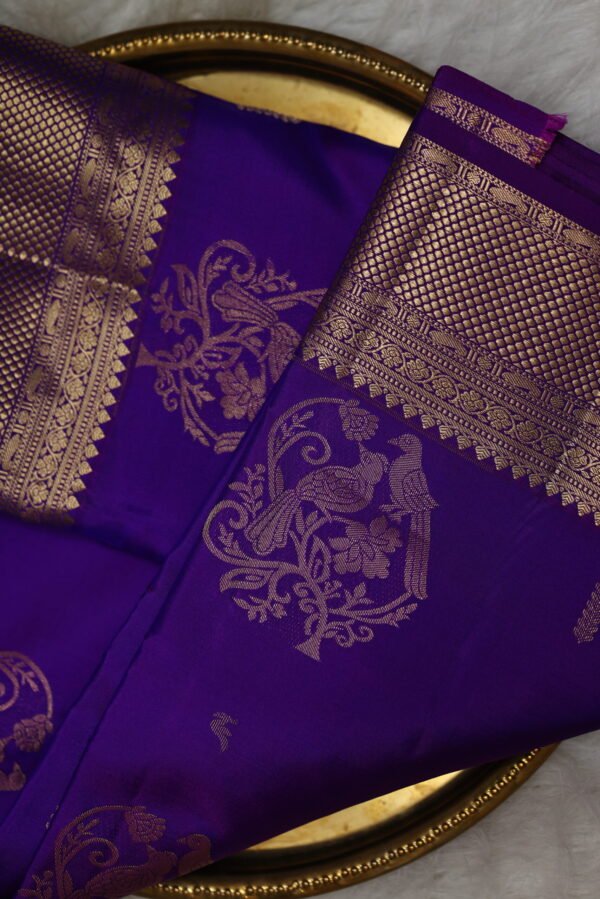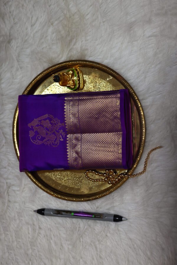 Ideal for grand weddings, festive celebrations, or cultural ceremonies, this saree exudes opulence and tradition. The purple base symbolizes royalty and creativity, while the interplay of big and small putta patterns adds depth and movement. Style it with kundan or polki jewelry to amplify the zari’s brilliance, or opt for pearl and silver accessories for a balanced, sophisticated ensemble.