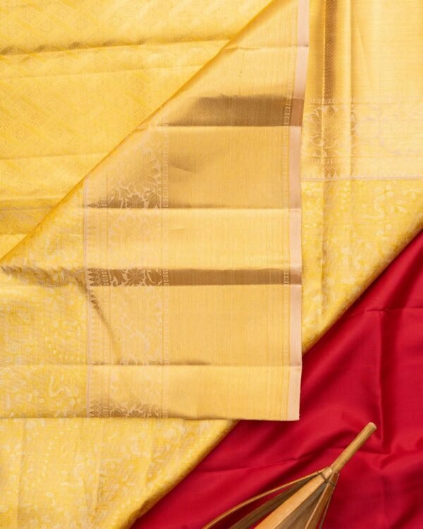 An opulent self-made Kanchipuram saree in full gold, adorned with a silver and gold zari floral body. The borders feature a captivating blend of Banaras-style weaving and floral patterns, measuring 9 inches and 5 inches. Paired with a matching gold blouse, this saree is the epitome of elegance and grandeur.