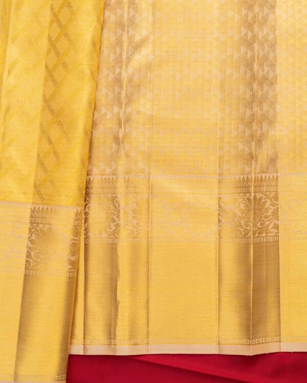 The borders showcase a perfect combination of Banaras-inspired weaving and delicate floral motifs, with sizes of 9 inches and 5 inches to add a balanced and striking effect. This stunning saree is complemented by a matching gold blouse, enhancing its regal appeal.