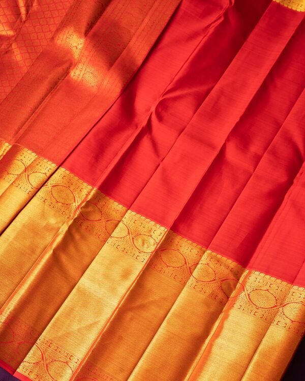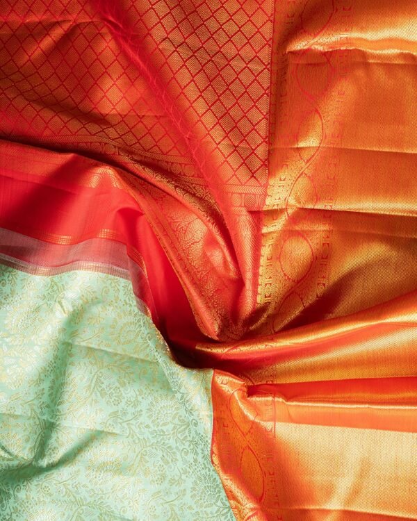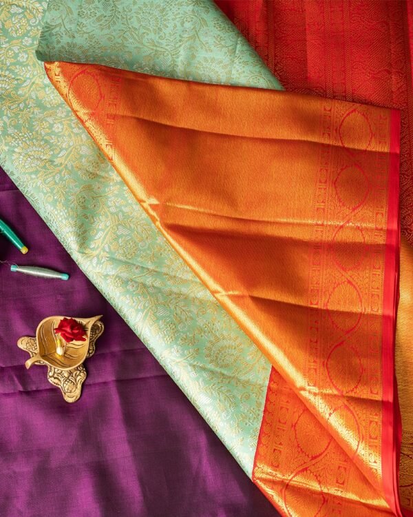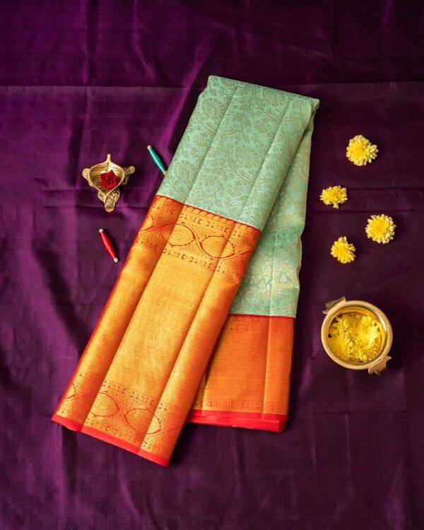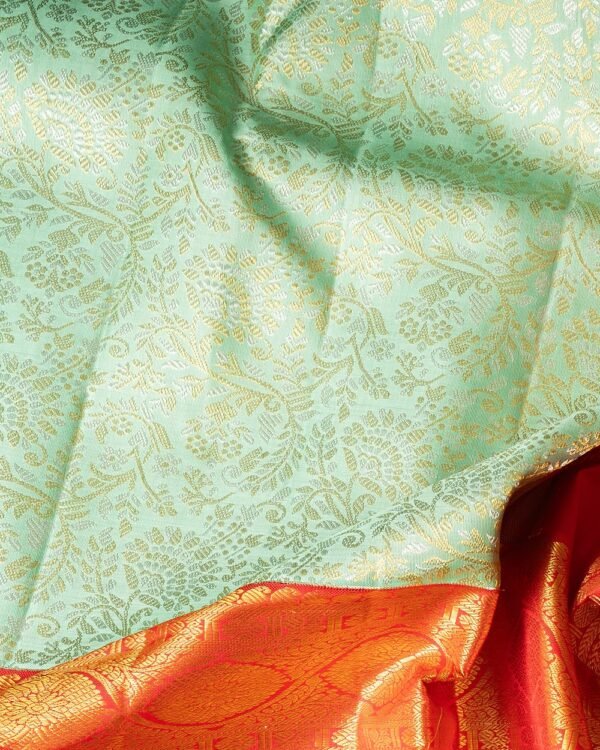 This elegant Kanchipuram saree features a silver and gold body with small floral designs. The borders are in vibrant red, showcasing floral patterns with a central Banaras-style design. The double borders—15 inches and 6 inches—add grandeur to the look.