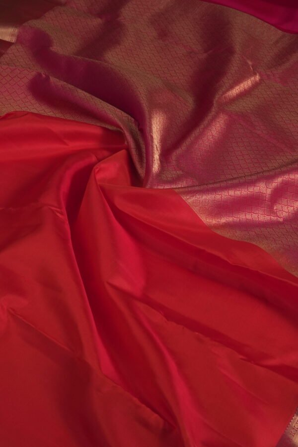 Embrace the vibrant fusion of bold elegance and traditional grandeur with our Blossom Gold Kanchipuram Plain Big Border Saree. This striking piece features a luminous deep bright pink body adorned with a bold, wide border intricately detailed with large gold motifs, elegantly complemented by a rich brown accent along the edge. Woven with pure mulberry silk and crafted using the revered korvai technique, this saree showcases the iconic Kanchipuram artistry, where the expansive border becomes the centerpiece of its opulent design. The harmonious contrast of vibrant pink, earthy brown, and shimmering gold creates a captivating blend of modern energy and timeless sophistication.