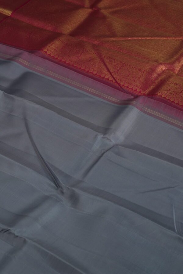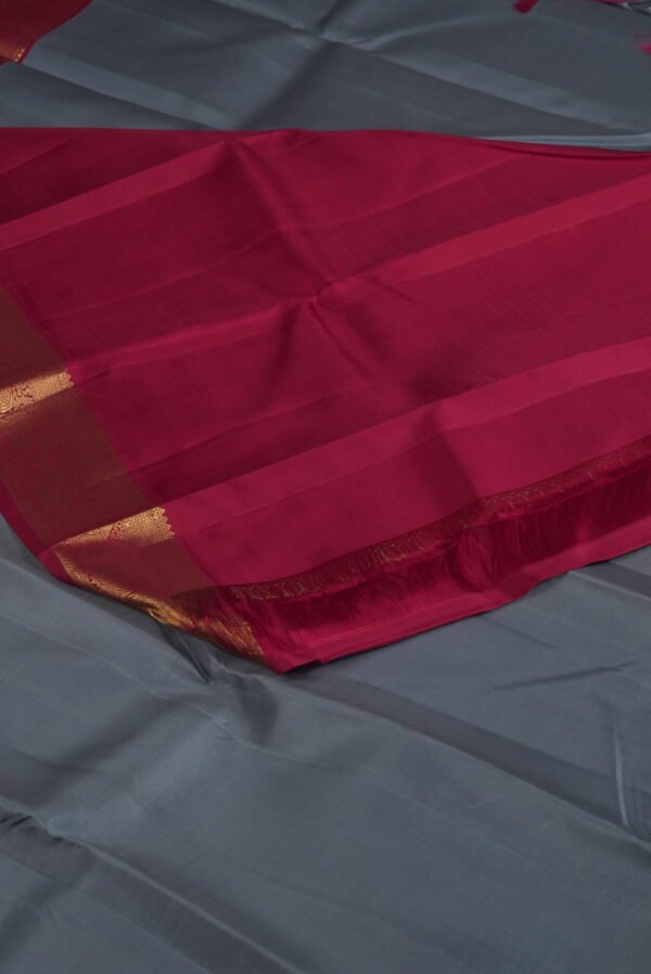 Embrace the sophisticated fusion of modern minimalism and timeless opulence with our Slate & Wine Kanchipuram Plain Border Saree. This elegant piece features a refined slate grey body adorned with a plain border intricately detailed with gold motifs, gracefully complemented by a deep burgundy accent along the edge. Woven with pure mulberry silk and crafted using the revered korvai technique, this saree embodies the artistry of Kanchipuram weaving, where understated coolness meets rich, regal warmth. The subtle yet striking contrast creates a captivating balance of contemporary grace and traditional grandeur.