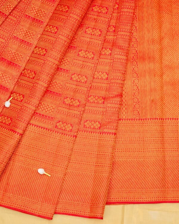 The saree is framed with an 8-inch double-sided border, designed in the classic Banaras style, which adds a regal touch to the overall look. The pallu continues the Banaras design, with a central diamond cut motif surrounded by delicate floral patterns, enhancing its beauty and grace.