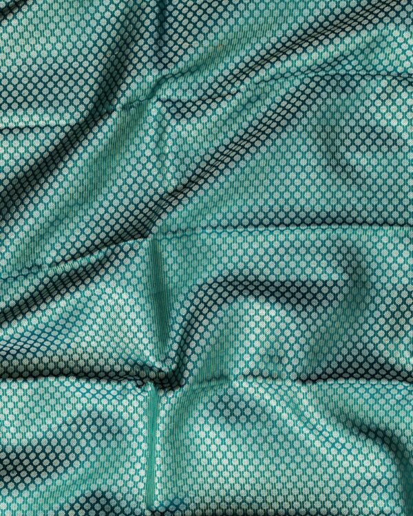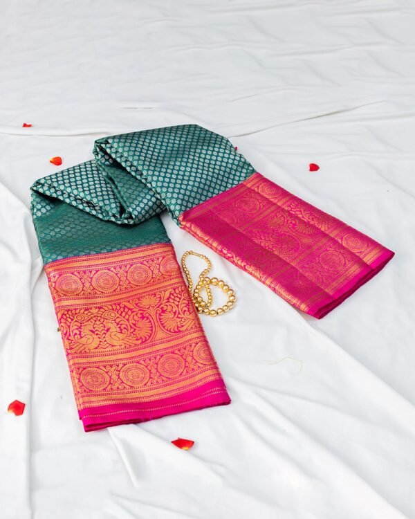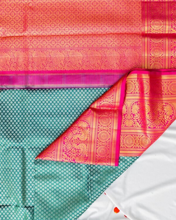 The saree features double-sided 10-inch borders, with Chaktras above and below and a majestic peacock design in the center, all intricately woven in gold zari. This design adds a royal touch and enhances the saree’s overall grandeur.