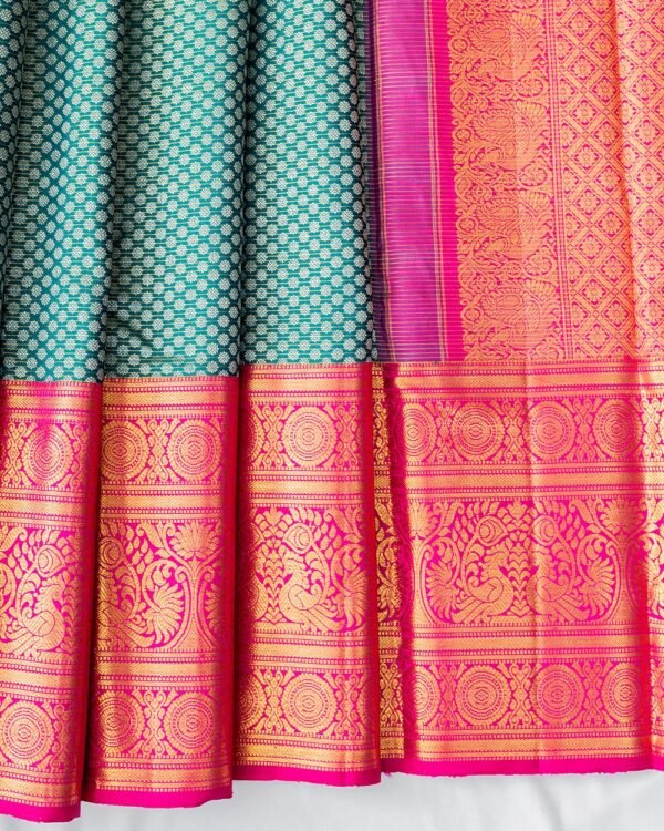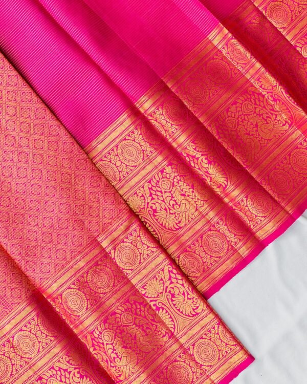 This exquisite Kanchipuram saree features gold zari lines with small floral patterns in silver zari across the body. The double-sided 10-inch borders showcase Chaktras above and below, with a peacock design in the center, all in gold zari. The pallu is adorned with a Vaira Oosi design, featuring peacock, floral, and diamond cutting details.