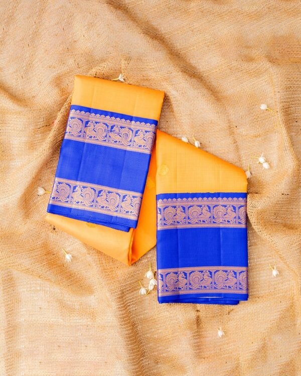 This elegant saree features a plain body with double peacock and ruthrajam puttas, complemented by an 8-inch border with peacock motifs and a gap border. The royal blue pallu showcases dual peacocks with diamond cutting in the center. The blouse is plain with a matching border.