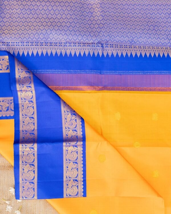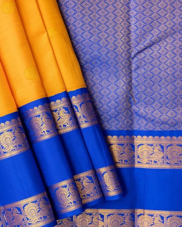 The pallu is a rich royal blue, featuring dual peacock designs that exude grandeur and tradition. The center of the pallu showcases diamond cutting patterns, adding a unique and refined finishing touch to the saree.