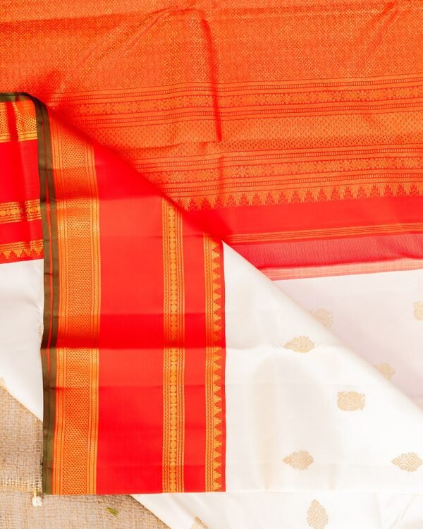 This exquisite Kanchipuram saree features a half-white body adorned with a gold thilagam design. The 8-inch double-sided border showcases a gap border with peacock motifs in red. The pallu is designed with intricate Banaras diamond cutting, while the blouse is a bold chilli red with a gap border.