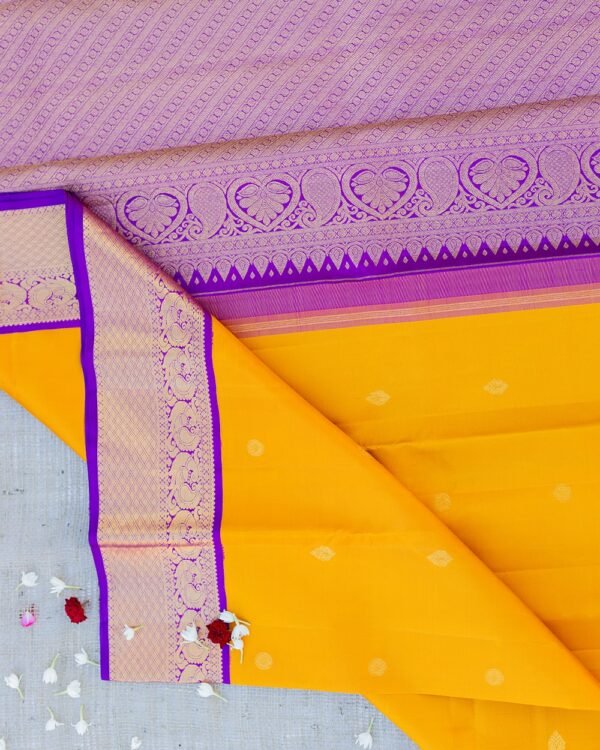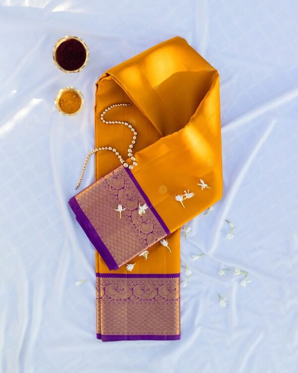 “Elegance and tradition blend seamlessly in this magnificent Kanchipuram saree from Muthu Handloom Weavers. The body is intricately designed with small puttas of Ruthraj, Mango, and flowers, all woven in an ancient style that exudes timeless beauty. The use of gold zari enhances the intricate patterns, making it a perfect choice for festive occasions, weddings, or cultural celebrations.
