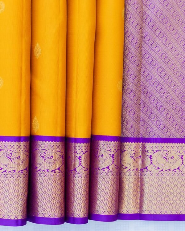 The double-sided 5-inch border is meticulously crafted, featuring stunning motifs of peacock and diamond cutting that add sophistication and charm to the saree. These traditional elements help to elevate the saree’s grandeur, ensuring it stands out in any event.