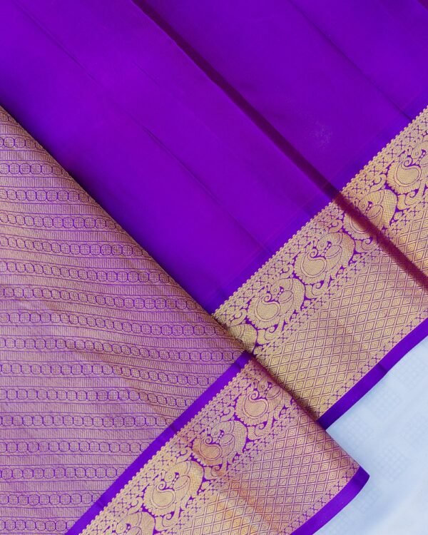 The blouse, designed in a rich magenta color, complements the saree’s traditional beauty while offering a modern touch. The combination of traditional and contemporary elements in this Kanchipuram saree makes it a must-have for any occasion that calls for elegance and grace.”