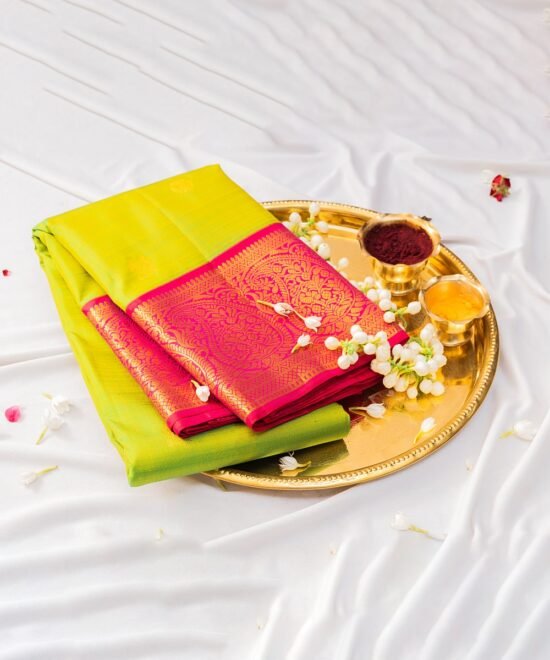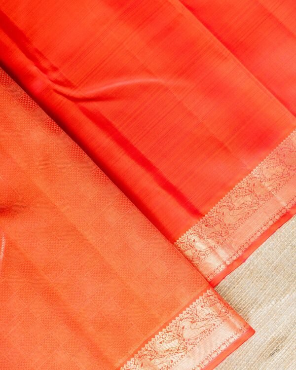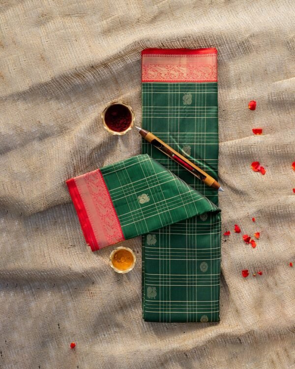 “Discover timeless elegance with this beautifully woven Kanchipuram saree from Muthu Handloom Weavers. The body is crafted with a combination of gold and silver zari, featuring large checks that add a bold and striking appeal. In the center, you’ll find alternating Ruthraj and peacock putta designs, symbolizing traditional art with a modern touch.