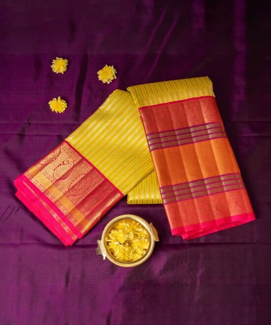 “Elegance meets tradition with this exquisite saree from Muthu Handloom Weavers. The body of the saree is designed with a beautiful silk threadwork check pattern, adding a touch of sophistication and classic charm. The intricate checks enhance the richness of the fabric, making it perfect for formal and festive occasions.