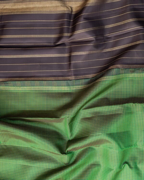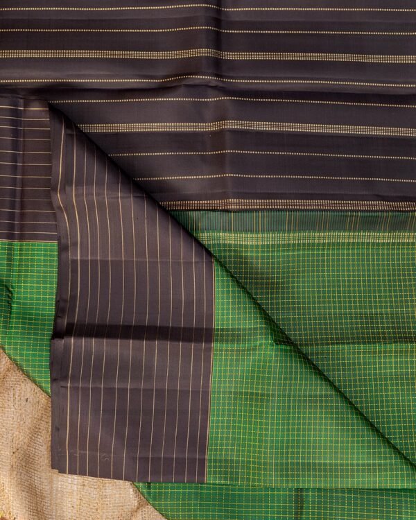 This stunning saree features a silk threadwork check pattern on the body, complemented by a 7-inch double-sided border with horizontal zari lines. The pallu showcases bold line strips, while the blouse is a sleek black with zari line strips.