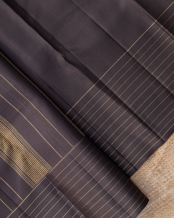 The saree is framed with a 7-inch double-sided border, featuring horizontal zari lines that offer a delicate contrast to the body’s design. The zari adds a subtle shimmer, enhancing the overall aesthetic of the saree and giving it a regal appeal.