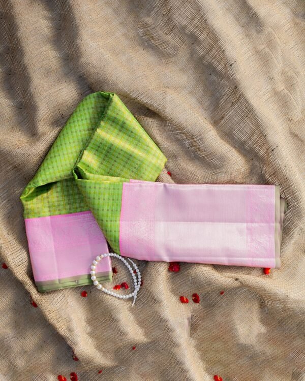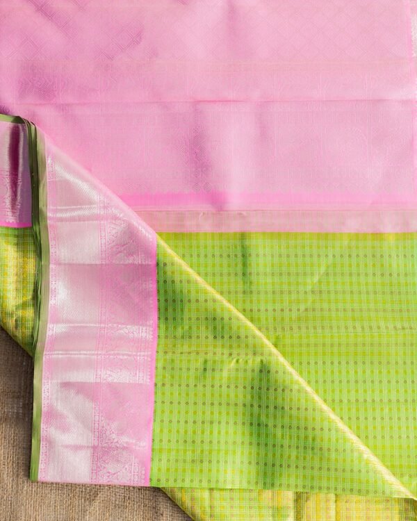 “Elevate your traditional wear collection with this stunning Kanchipuram saree from Muthu Handloom Weavers. The body is a delicate fusion of zari and tissue, featuring small check patterns in silver and gold zari, complemented by touches of pink zari. This combination of colors and textures adds a modern twist to the classic Kanchipuram design.