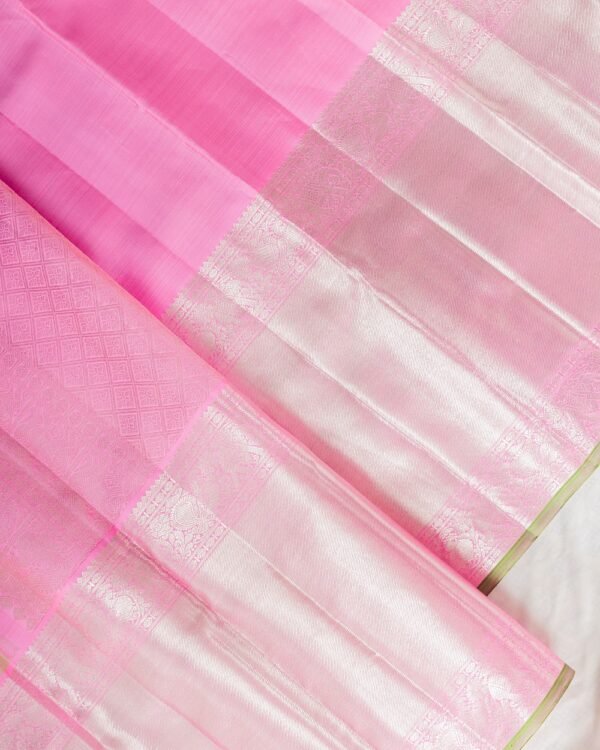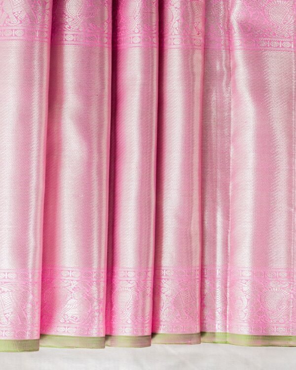 This beautiful Kanchipuram saree features a silver and pink zari tissue body with small check patterns. The 15-inch and 6-inch borders showcase intricate peacock and elephant motifs with silver zari and Banaras-style designs. The pallu is in baby pink with silver zari, adorned with peacock, Yalli, and a diamond-cut center. The blouse is plain baby pink, completing the regal look.