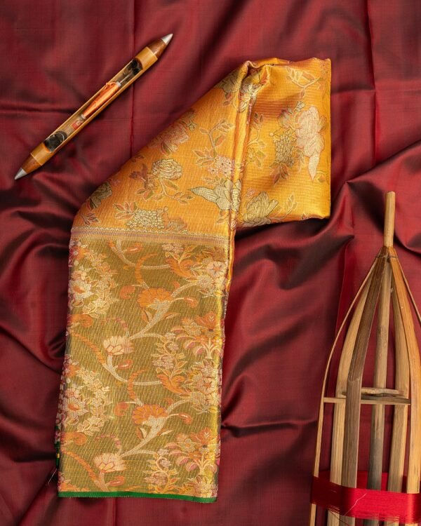 “A true testament to craftsmanship and tradition, this saree showcases a beautiful blend of gold and silver zari, intricately woven to form a floral design adorned with multi-colored flowers. The design exudes uniqueness and antique charm, perfect for a timeless collection.