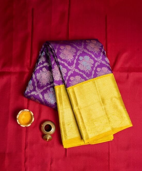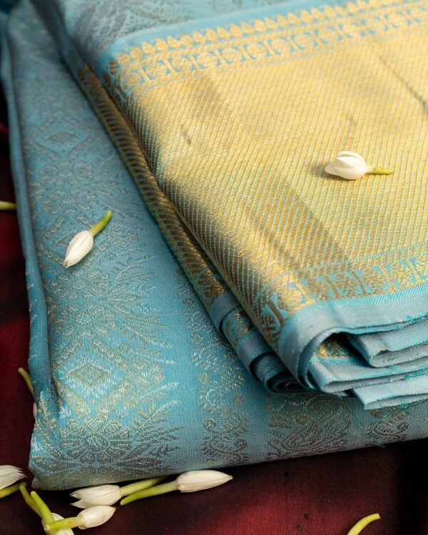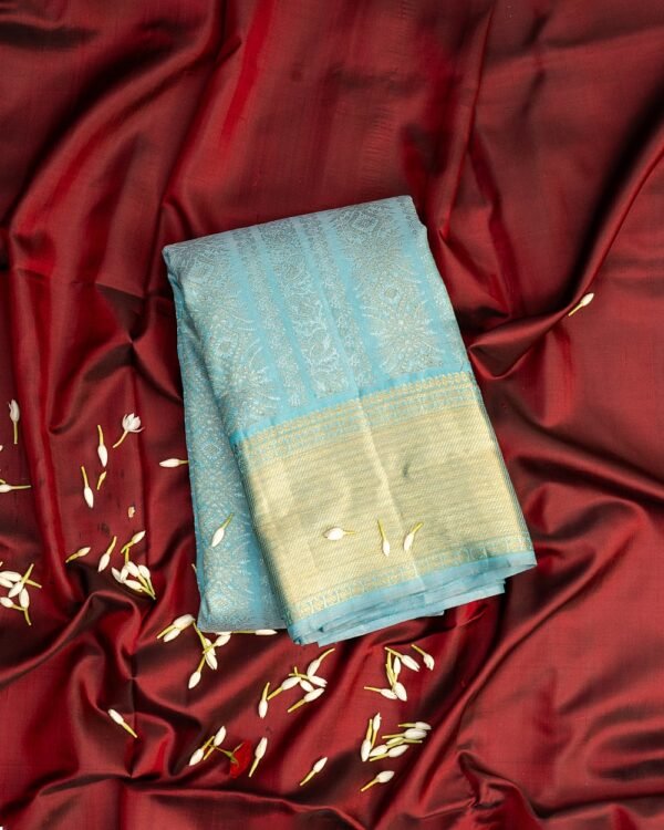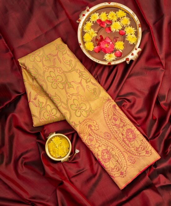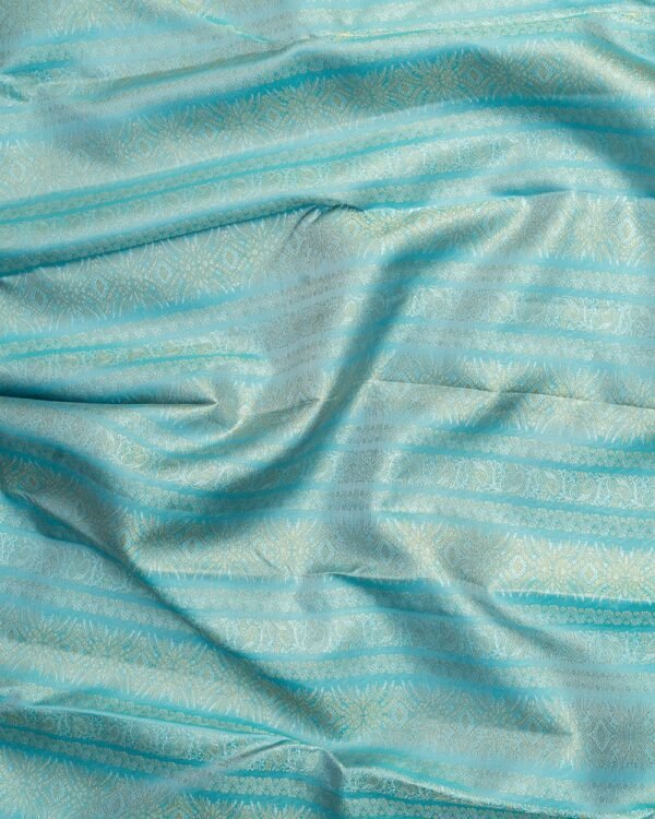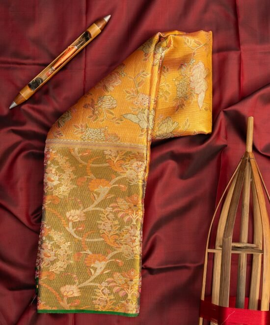 “Elegance and sophistication define this saree, where alternating silver and gold zari strip lines create a stunning visual effect. The floral patterns delicately embellish the body, bringing a touch of nature’s beauty to the design.