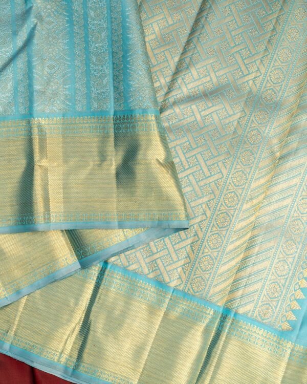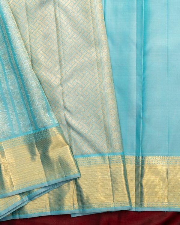 This exquisite saree features alternating silver and gold zari strip lines with floral patterns across the body. The 6-inch border is designed in a thick Banaras style, while the pallu showcases ruthrajam and floral designs with a honeycomb pattern. The blouse is plain with a matching Banaras pattern for a refined finish.