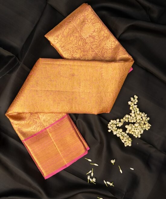 “Elegance and sophistication define this saree, where alternating silver and gold zari strip lines create a stunning visual effect. The floral patterns delicately embellish the body, bringing a touch of nature’s beauty to the design.
