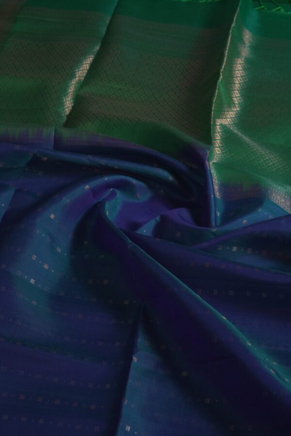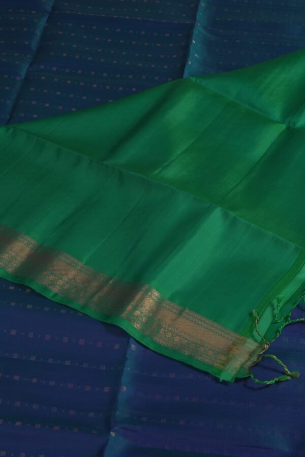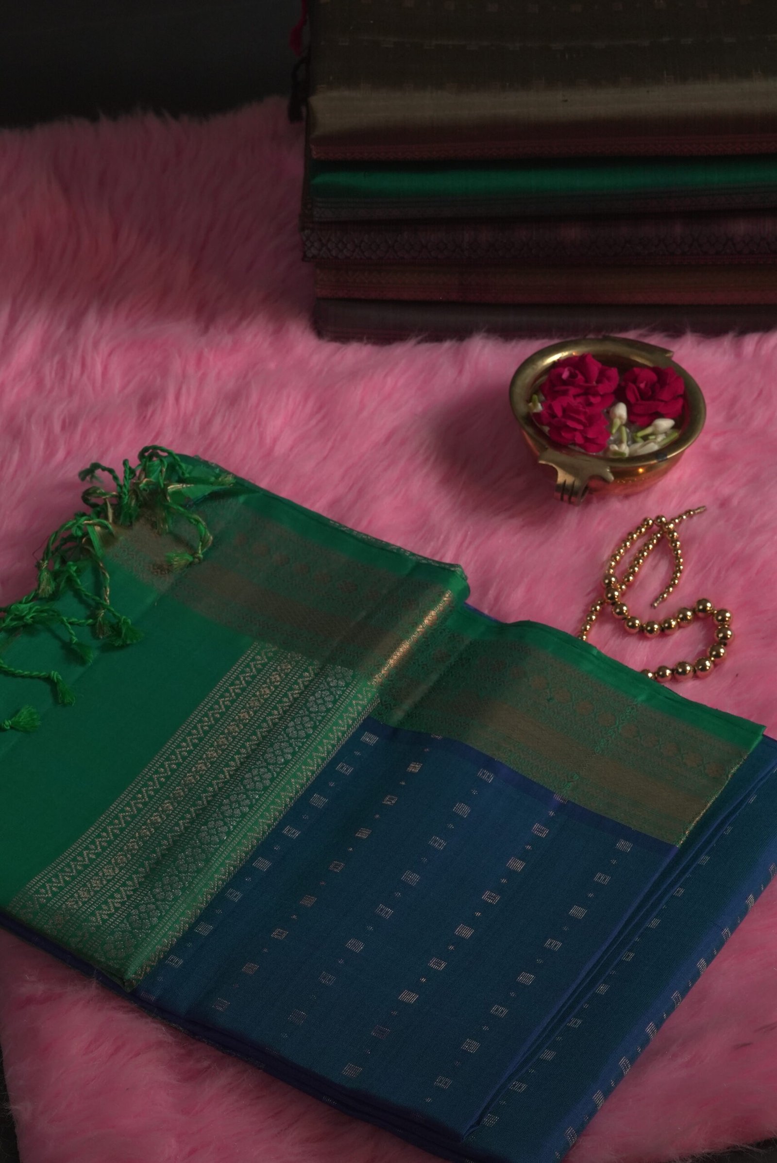 Embrace the serene harmony of sky and earth with our Azure Meadow Pure Soft Silk Saree, a captivating piece from our Pure Soft Silk collection. This exquisite saree features a tranquil blue body adorned with a vibrant grass green border intricately detailed with delicate motifs. Crafted from luxurious pure soft silk, the saree offers a fluid drape and a gentle sheen, while the contrasting colors and artistic patterns create a refreshing blend of calm and vitality.