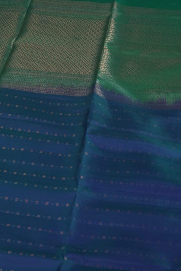 Perfect for spring weddings, daytime events, or festive gatherings, this saree balances soothing elegance with natural energy. The blue base evokes the serenity of a clear sky, while the grass green border and motifs infuse a touch of organic freshness. Style it with silver or pearl jewelry to enhance its cool tones, or opt for floral-inspired accessories to complement its garden-party charm for a cohesive, elegant look.